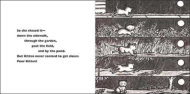 Below are four spreads from inside Kitten's First Full Moon, showing the confused little kitty running to get near to the big bowl of milk in the sky.