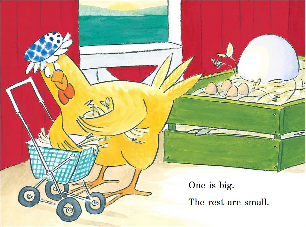 This book caught us by surprise. It's actually pretty fun!! It tells the story of a hen, who wakes up one morning to find a gigantic egg in her nest and sets off in search of the rightful owner.