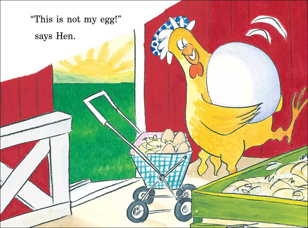 When hen finds an extremely large egg in his nest, he sets out to find its mama. A silly book with a sweet message.