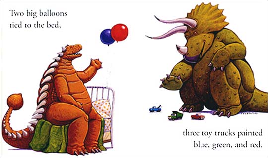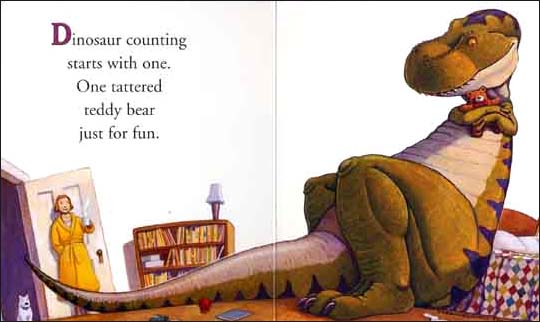 One downside (as far as using it with kids just learning to count): the pages do not include the numerals, just the words and objects. But despite this small downside, we really like this book. Yolen's rhyming text is bouncy and fun (ie: "Dinosaur counting starts with one. One tattered teddy bear just for fun.") And Teague's illustrations strike just the right balance for this age group-- 'scientific' enough for young dinosaur fans to recognize the tyrannosaurus rex, pteradactyl, etc, yet also playful enough to match the book's silly premise.