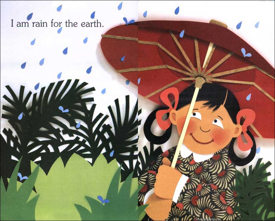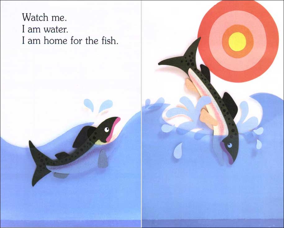 I Am Water summary: Simple text and colorful cut-paper illustrations combine in a celebration of the beauty and usefulness of water that depicts such objects as a rainy day, steam cooking, and ice cubes.