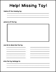Every kid has a favorite toy, just like Trixie's bunny, and if it suddenly disappeared, it'd be really helpful to have a Missing Toy poster already created! Using the flyer at the right (larger version here: Knuffle Bunny activity), have your students create a poster about their favorite toy. Before they start, talk about how important it is to be as detailed as possible--in the description and in the drawing--since most other people have never seen their toy before. Their description will be very important in getting the toy back if it is ever lost. :)