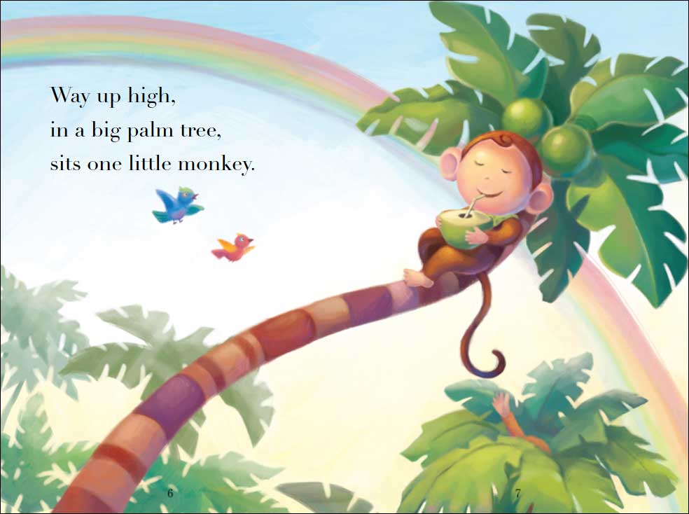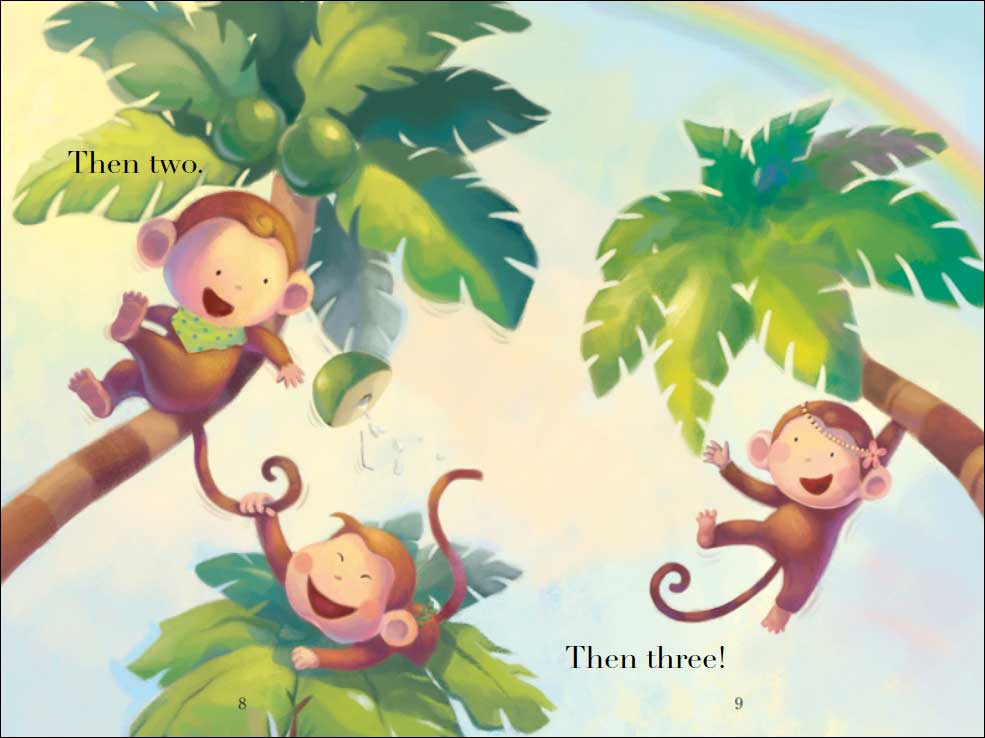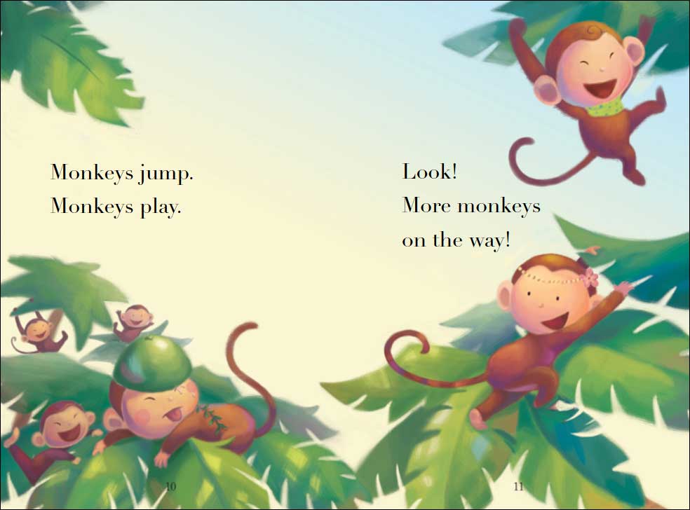 by one, monkeys add to the jungle fun--swinging from palm trees, hiding
