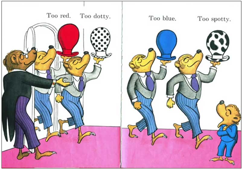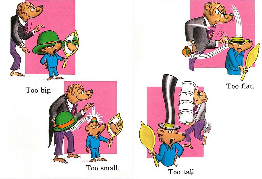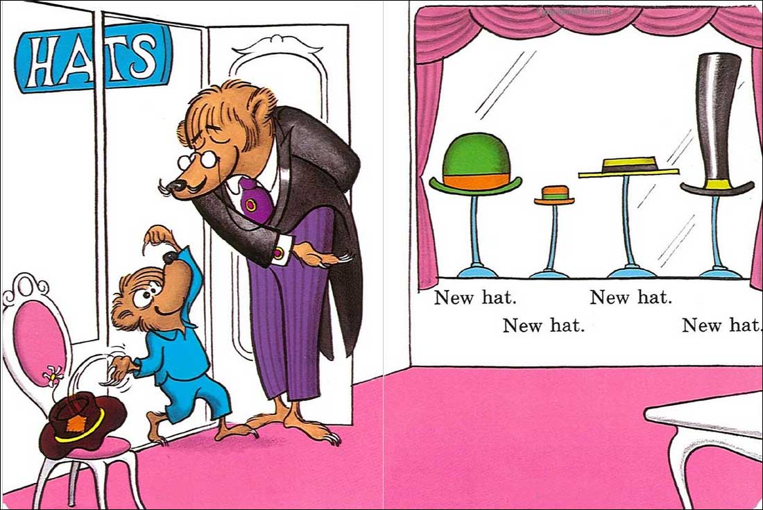 The bears are out shopping for a new hat, and come across a range of silly, frilly, lumpy, bumpy... hats until they find the one that is just right.